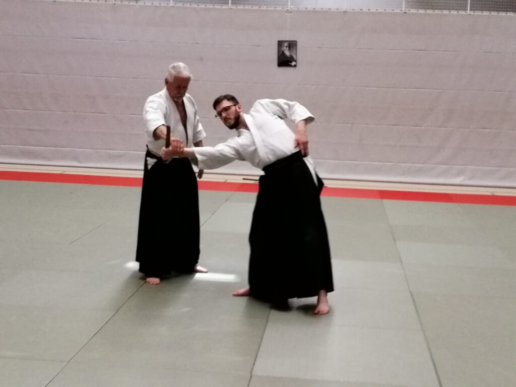 Am Freitag hatten wir auf Alfreds Wunsch hin das Vergnügen während der Abendeinheit bei Francois Noizée zu trainieren. Nach einer Einführung in die Stabkata seines Verbandes (FAT: Fédération d‘Aïkido Traditionnel) übten wir im Sinne des Setting eines Randoris Stabtechniken. Den Abschluss dieses sehr interessanten Trainings bildeten Formen aus der Schwertkata mit 8 Formen. Meister Noizée merkte man an, dass unsere französischen Freunde sehr geübt in der Arbeit mit den Waffen sind und damit wahrlich meisterlich umgehen. Davon schneide ich mir gerne eine scheibe ab und freue mich schon jetzt darauf, dass wir Francois am Wochenende vor dem 1. Mai 2023 nächsten Jahr bei uns in Lübeck zum Lehrgang werden begrüßen können.