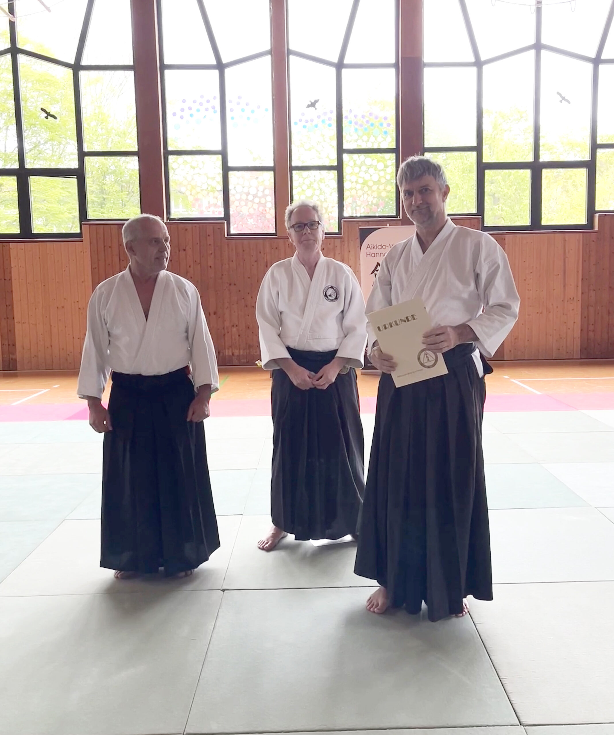 Bundestrainer und Vorsitzender der TK, Karl Köppel (8. Dan Aikido), verlieh Claus-Dieter unter dem Applaus aller Teilnehmenden die Urkunde zum 6. Dan Aikido während des Bundeslehrganges am 20.04. in Hannover. Unser Vorsitzender, Norbert Knoll, überreichte Claus-Dieter als symbolische Geste ein rot-weißes Absperrband, bis der standesgemäße Kohaku Obi (rot-weißer Gürtel) fertiggestellt ist, mit dem der AVNI Claus-Dieter zu diesem besonderen Anlass ehren möchte.