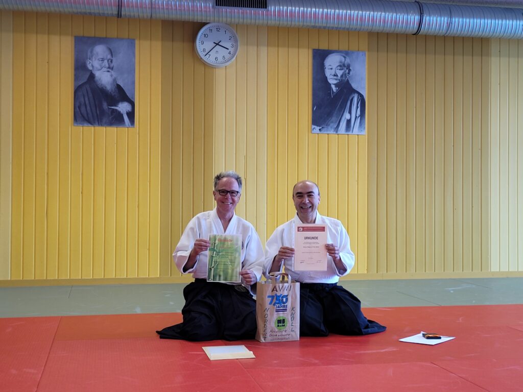 Am Wochenende vom 14.09.-15.09.2024 feierte Dr. Damian Magiera, 5. Dan Aikido, im Rahmen eines Aikido-Landeslehrganges sein 40-jähriges Mattenjubiläum. Über 30 Aikidoka verschiedenster Grade sind aus ganz Niedersachsen angereist, um Damian zu seinem Mattenjubiläum zu gratulieren und es mit ihm zu feiern. Norbert Knoll, 5. Dan Aikido und 1. Vorsitzender des Aikido-Verbandes Niedersachsen, überreichte Damian feierlich die Urkunde zum 40. Aikidojahr. In dem Rahmen wurde zu seiner Überraschung dann auch Norbert Knoll, der ebenfalls einen Grund zum Feiern hatte, herzlich gratuliert, denn er feierte kürzlich einen runden Geburtstag. Happy Birthday! 😊